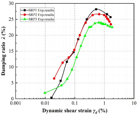 It can be seen in Figure 13, taking the 20% rubber volume content specimens under a confining pressure of 100 kPa as an example, that as the rubber particle size increases, the damping ratios of the mixture specimens decrease. In particular, the damping ratio curve for SRP1 moves close to that for SRP2 and even overlaps, while SRP3 curve remains far away from the other two.
