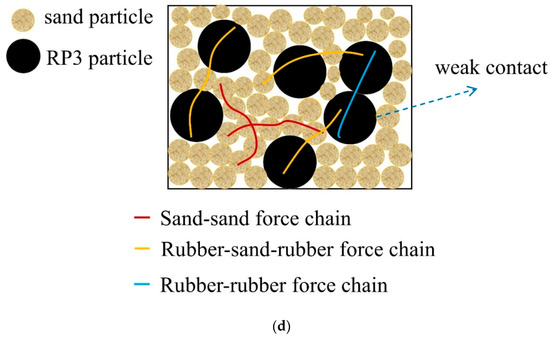 Schematic diagram of internal contact and force transmission chains in (a) pure sand; (b) SRP1; (c) SRP2; (d) SRP3.