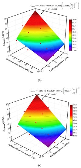 Empirical model of maximum dynamic shear modulus (Gdmax) according to rubber content and confining pressure for different rubber particle sizes: (a) SRP1; (b) SRP2; (c) SRP3.
