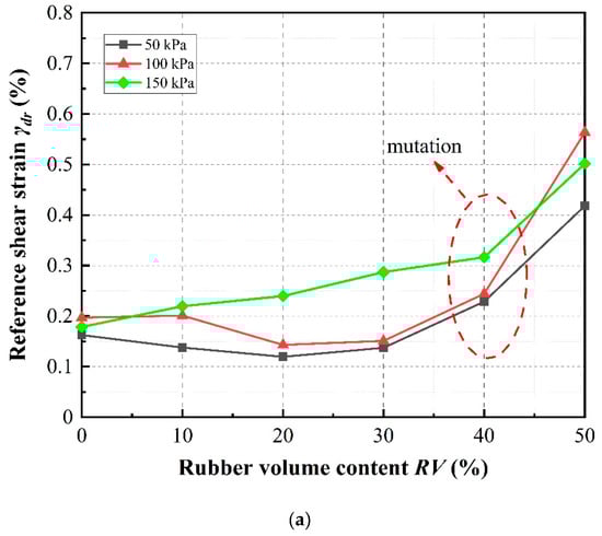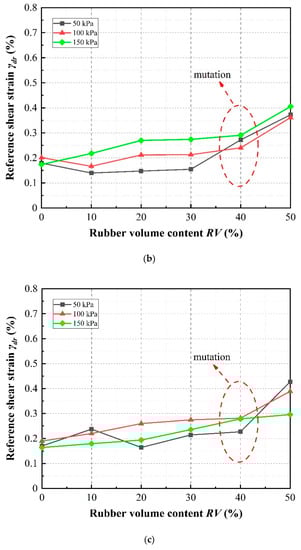 Figure 20 shows that the reference shear strain obtained using Equations (13) and (16) almost increases with increasing rubber volume content under different confining pressures. The reference shear strain can be observed to increase significantly under a confining pressure of 150 kPa, while several opposite trends can be observed under confining pressure of 50 kPa and 100 kPa especially for low rubber content. Furthermore, it is also observed that, at rubber volume contents less than about 40%, the reference shear strain, almost exhibiting only a slight increase with increasing rubber volume content, whereas the shear strain increases considerably with increasing rubber volume content values greater than 40%. These observations can be explained by the fact that more rubber particles come into contact with each other with increasing rubber volume content and confining pressure. The stress–strain relationship of the mixtures becomes more similar to that of pure rubber, indicating the development of rubber-like behavior. This observation is compatible with the results of Liu et al. [11]. Therefore, the slope of the stress–strain diagram decreases, resulting in an increase in the reference shear strain values. While under low rubber volume content and confining pressure, these contacts were not obvious, the reference shear strain values increase inconspicuously and even appear to be on a converse trend.