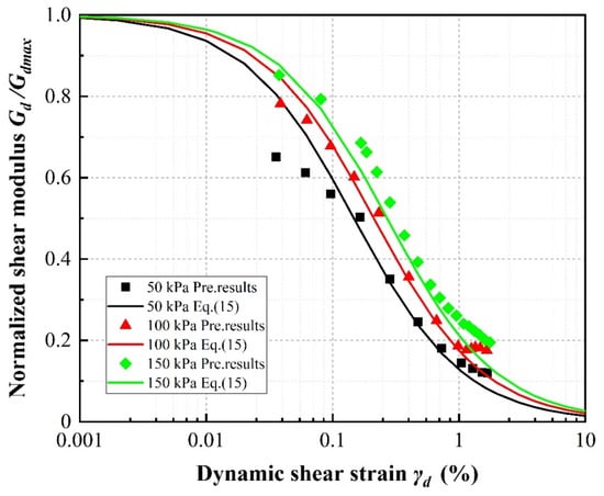 Figure 21, Figure 22 and Figure 23 show the normalized dynamic shear modulus, defined as Gd/Gdmax, versus dynamic shear strain under various rubber volume content values, rubber particle sizes and confining pressures, respectively. The values of Gd/Gdmax shown in the curves were determined using the right side of Equation (15) and the predicted results were determined by applying the results of Equation (16) as Gdmax on the left side. It can be observed that the predicted results are in relatively good agreement with the calculation results, further illustrating that the new model can be confidently used to predict the attenuation of the shear modulus in the design of sand–rubber mixtures. For any constant confining pressure and rubber particle size, increasing rubber volume content causes the values of Gd/Gdmax to increase. This phenomenon is the result of an increase in material stiffness with increasing confining pressure and indicates more elastic and flexible (uniform) mixture behavior with increasing rubber volume content (Figure 21). It can be further observed that the values of G/Gdmax increase with increasing rubber particle size (Figure 22) and confining pressure (Figure 23).