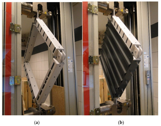 Experimental research was intended to investigate a wide range of panel behaviour at shear. The experimental set-up was designed for the corrugated sheet investigation; however, it can also be used for other types of panels (e.g., sandwich, wood or textile panels or parts of roofs consisting of purlins and trapezoidal sheeting). A static model of the permanent set-up is presented in Figure 1, the main elements are shown in Figure 2. Four pin-ended rectangular hollow section members form a square frame with four hinged nodes in the frame plane. The axial dimension of the frame was 850 mm (width and length: a and b in Figure 1). The dimensions of the set-up were assessed according to the technological condition that the largest dimension in the direction of square frame diagonal must be less than 1350 mm, i.e., the maximum allowable spacing between the fastening elements of the testing machine.