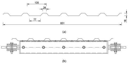 Specimens’ details: (a) trapezoidal sheeting geometry [mm]; (b) trapezoidal sheeting fastened to the permanent frame (scheme of the fasteners).