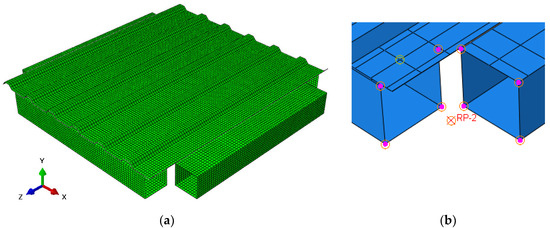 The frame members and corrugated sheets were modelled by 20,100 shell elements with four nodes and four integration points (S4) and the size of 8–12 mm. Profiles were built with sharp corners (radius of curved elements equal to zero). The meshed structure is presented in Figure 5a.