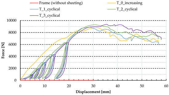 In the next step, three cyclic loading tests were conducted on trapezoidal sheeting panels. The diaphragms were loaded six times in every test; each step brought an increasing force level. The last increment led to failure of the panel. The force–displacement path of the main nodes registered by the testing machine is presented in Figure 6 and Figure 8; see “T_1_cyclical,” “T_2_cyclical” and “T_3_cyclical”.