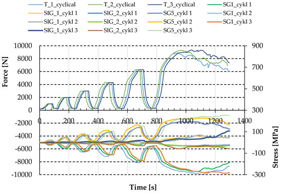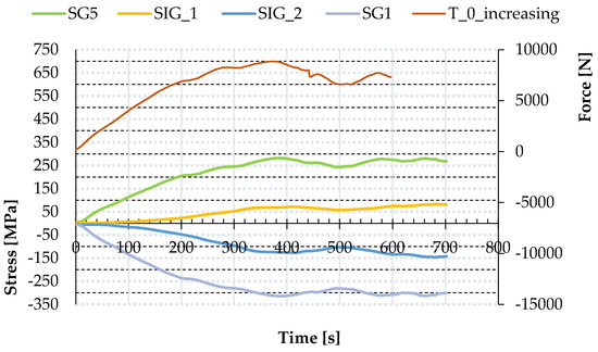 Similarly to the increasing loading case, in the case of repeated loading strains were also measured by strain gauges (the location of the strain gauges is addressed in point 2.3), leading to stresses: SG1 and SG5—the stresses in the direction perpendicular to the corrugation (top and bottom side of the sheeting respectively); and SIG_1 and SIG_2—the principal stresses in the location of strain gauges rosette, as presented in Figure 9.