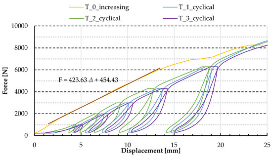 The trend line for the test with increasing load is shown in Figure 8, where: F is force and Δ is displacement. According to the trend line equation, the primary stiffness of the panel is 0.424 kN/mm. The force–displacement relations for increasing and repeated loading make us conclude that both primary and secondary stiffness of the panels in four tests are comparable. Simultaneously, translation of the diagrams is observed. It can arise from different initial clearances in particular panels triggered by assembly imperfections, thus means it can also occur in real structure situation.