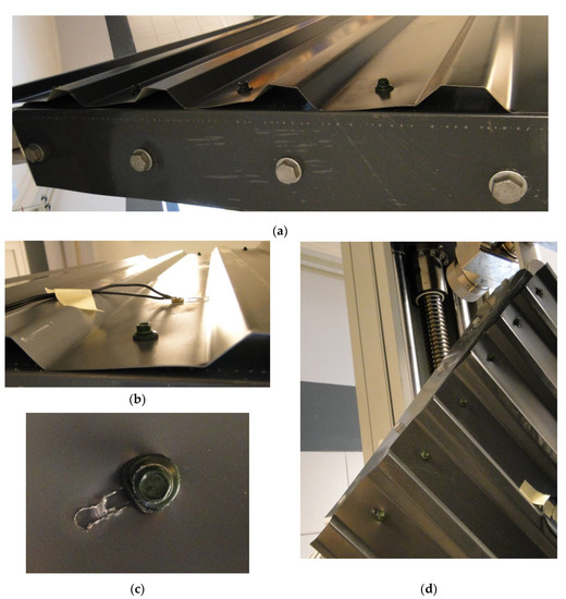 In nodes 2 and 4 (see Figure 1) extra elements were provided to allow fastening the set-up to the testing machine. These extra elements were totally fixed in both top and bottom fastening element of the testing machine. Next, every extra element was pin-joint in the hinges of the square frame with possible rotation about the axis perpendicular to the plane of the frame; see Figure 3b and Figure 4a. Similar hinges have been constructed in nodes 1 and 3 in Figure 1, as presented in Figure 2. The bottom fastening element was fixed in the initial point during the experiment while the testing machine was inducing displacement of the top fastening element in the vertical direction. Due to pin connection of members, the permanent set-up (square frame) was a mechanism not to resist shear (comparing to the diaphragm stiffness). It allowed us to investigate the resistance and stiffness of shear panels made of corrugated sheeting installed to the frame. Sheet/purlin (or sheet/rafter) fasteners were applied, so flexibility, location and influence of the connection on corrugated sheeting were taken into account. Flexibility of the support elements (purlins, rafters) was included with the use of U-shaped cold-formed plates. The plates were fixed to rigid rectangular hollow section (RHS) profiles in order to fasten the sheeting. Specifications of the applied elements are widely discussed in Section 2.2.