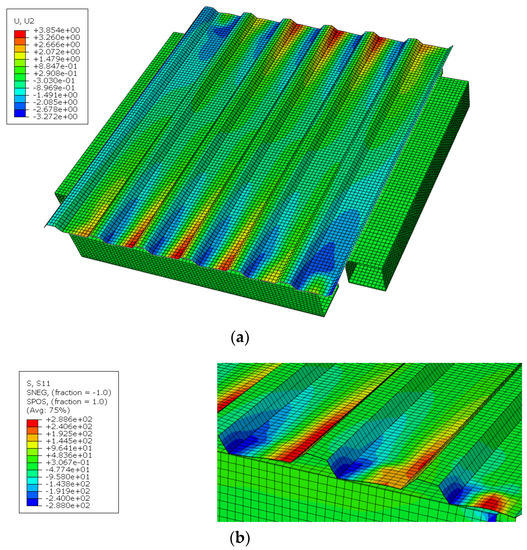 Selected results of the numerical analysis: (a) displacements in the direction perpendicular to the panel [mm]; (b) stresses in the direction perpendicular to the corrugation [MPa].