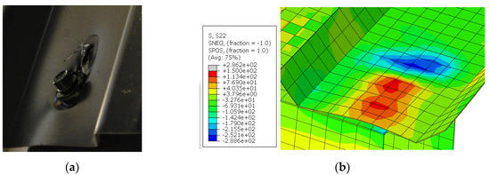 The comparison of the results in the area of self-drilling screw: (a) test, (b) numerical model (stresses in the direction parallel to the corrugation [MPa]).
