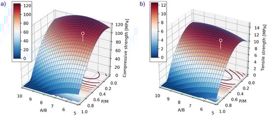 Compressive (a) and tensile (b) strength of concrete mix vs. the material variables x1 = A/B (aggregate to polymer binder mass ratio), x2 = P/M (waste powder to microfiller mass ratio), B/M = 0.5.