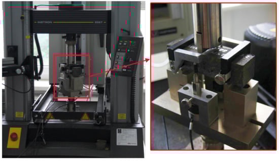 The flexural strength under one-point loading was done in accordance with EN 12390-5. Beams of 40 × 40 × 160 mm were cast and cured in water for 28 days. The flexural strength test was carried out using the Instron 5567 testing machine (Instron, Norwood, MA, USA), as shown in Figure 2.