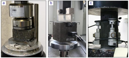 (a) Compressive strength test on Controls MCC8 hydraulic press, (b) wedge splitting test (WST) test on the Instron 5567 machine, (c) modulus of elasticity testing.