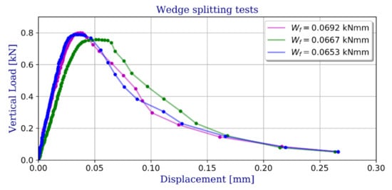 To fully reveal the material characteristics on fracture toughness, a wedge splitting test (WST) was conducted as shown in Figure 4b. A WST was chosen for this purpose as a stable test, i.e., with a descending branch in the overall load-deformation diagram [20]. The aim of WST test was to measure the amount of energy necessary to split the specimen into two halves. This fracture energy, divided by the projected fracture area was, assumed to be the specific fracture energy GF. Three samples of 100 × 100 × 100 mm with an initial notch 30 mm wide and 20 mm thick were used. The test was undertaken with a controlled speed of notch opening of vCOD = 0.1 mm/min. The obtained graphs of the vertical load versus the crack mouth opened deflection (CMOD) are shown in Figure 5.