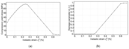 where , is the mean value of the compressive strength, is the strain corresponding to , is the mean Young’s modulus in compression and is the maximum strain for which the above relation holds. Material parameters , , and were estimated based on the uniaxial compression test results. Additionally, it was assumed that the end of the elastic range corresponded to 40% of the uniaxial compressive strength, i.e., . For a close-to-linear drop of stress was assumed before failure. The resulting CDP model input is shown in Figure 7a. In this figure, the curve begins from the value of and its maximum corresponds to .