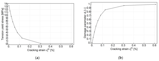 where is the initial (undamaged) modulus of the material. The degradation variable is defined separately for compression () and tension () as the function of compressive inelastic strain () and tensile cracking strain (), respectively. Degradation parameters can be later used in postprocessing to visualize possible crack directions in a structure after failure. Plastic strain values are automatically calculated using the following formulas: