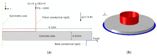Geometry and boundary conditions (SI units) of the finite element model: (a) axisymmetric model, (b) 3D model view.