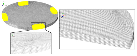 For the axisymmetric case, the concrete plate was discretized with four-node bilinear, reduced integration finite elements with hourglass control, which led to a fully regular rectangular mesh. The different average global size of these elements was assumed for convergence study. The three-dimensional plate was discretized using eight-node linear, reduced integration brick elements. The finite element mesh of the 3D model is shown in Figure 11, where elements with an aspect ratio greater than 1.5 are highlighted to ensure that there are no poor-quality elements in the zone where damage was expected.