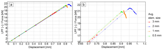 A mesh convergence test was carried out using the axisymmetric model. Curves of the load proportionality factor [21] versus deflection in the middle of the plate were obtained using the Riks algorithm for four different average global element sizes. The input force to the model was equal to 1 kN (see Figure 9a) so that the load proportionality factor could be read as the applied force in kN. The results of the analysis are shown in Figure 12. For element sizes smaller than 3 mm, a sufficient convergence was obtained.