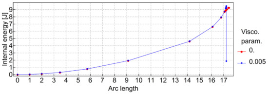 In order to check if the viscous parameter (see Table 5) was small enough to eliminate any interference in the results, internal energy for the whole model with an average element size of 1 mm was compared to the case with no viscous stabilization. The comparison is shown in Figure 13.