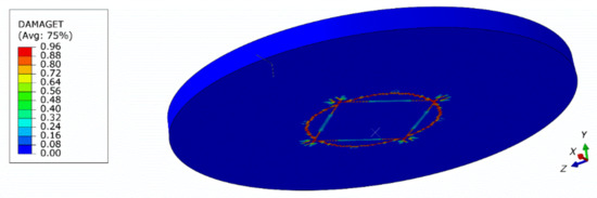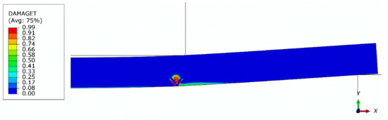 Contour plot of the tension damage parameter () after failure (3D model, global mesh size: 3 mm).