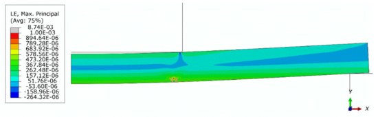 Contour plot of the maximum principal logarithmic measure of strain (3D model, global mesh size: 3 mm).