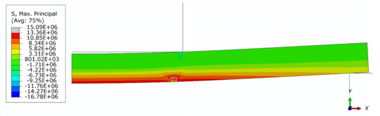 Contour plot of maximum principal stress after failure (axisymmetric model, global mesh size: 0.5 mm); deformed configuration; displacements scaled 10 times.