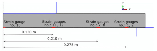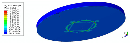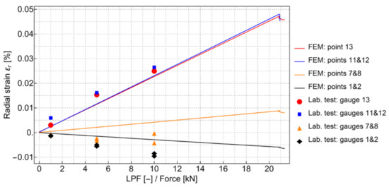 The FE analysis results were compared with data obtained from the experiment presented in Figure 11. The localization of strain gauges used in the experiment is shown in Figure 20 in relation to the axisymmetric FEM model. The comparison of radial strain between the experiment and FEM model is shown in Figure 21.