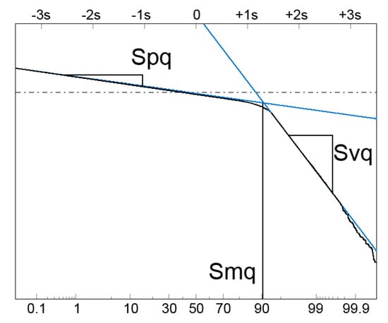 In the other approach, based on material probability curve (ISO 13565-3 standard), two parts of two-process surface appear: plateau (peak) and valley [,,,]. Material probability curve is a representation of the material ratio curve; the material ratio is expressed as Gaussian probability in standard deviation values, plotted linearly on the horizontal axis (−3s = 0.13%, −2s = 2.28%, −s = 15.8%, 0 = 50%, s = 84.13%, 2s = 97.72%, 3s = 99.87%). The probability plot of two-process surface presents two straight non-parallel lines. The Spq parameter is the rms. height of the plateau part and the Svq parameter is the rms. height of the valley part. The Spq and Svq parameters are the slopes of the linear regressions through the plateau and valley parts, respectively. This approach contains also the Smq parameter, which is the material ratio at the transition point between plateau and valley parts—Figure 1. Since these parameters are statistical, similar values can be obtained for 2D profile and 3D (areal) texture. Because this method is based on theoretical presumptions, it can be applied in multi-process surface modeling. This material ratio curve is related to tribological properties of functional elements such as a load-carrying capacity and a wear resistance [].