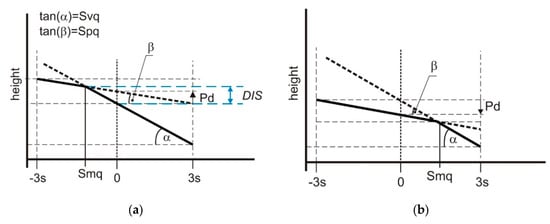 Probability plots of material ratio curves for different two-process surfaces; the Smq parameter is smaller than 50% (a) and the Smq parameter is higher than 50% (b) with plateau depth Pd and the vertical distance between two modes DIS.