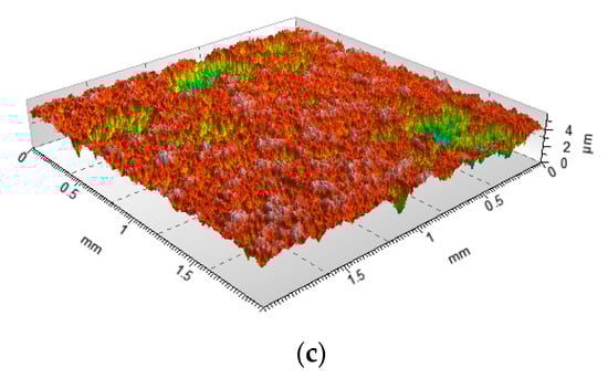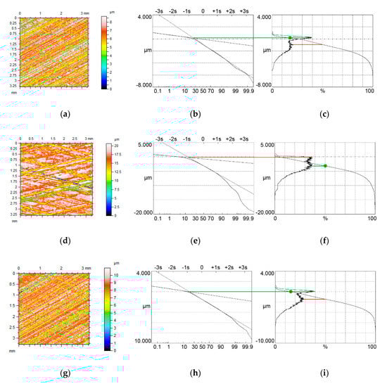 The surface shown in Figure 9a–c was tested in high temperature (80 °C). The Svq/Spq ratio was higher than 5. The upper peak was the major mode, therefore this mode corresponded to the Smq material ratio of 24%. The second and the third surfaces were tested in negative temperature (−20 °C). The Svq/Spq ratio of the surface shown in Figure 9d–f was near 6. The Svq parameter of this surface was comparatively high (2.89 µm). However, due to a low value of the Smq parameter, the lower peak became the major mode and therefore this mode occurred for the material ratio of 50%. The Svq/Spq ratio of the third surface shown in Figure 9g–i was the smallest (near 4). However, due to the material ratio at the transition point equal to 20%, the upper peak was the major mode, the position of which corresponded to the Smq parameter.
