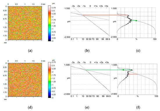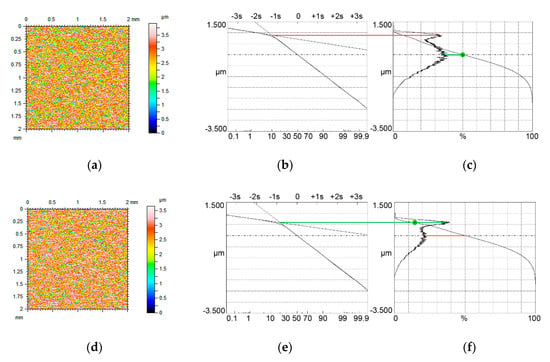 Contour plots (a,d) surface probability plot (b,e), material ratio curve and probability distribution (c,f) of two-process measured surfaces characterized by the following parameters: Spq = 0.61 µm, Svq = 2.04 µm, Smq = 38% (a–c) and Spq = 0.43 µm, Svq = 2.51 µm, Smq = 84%, both surfaces have unimodal ordinate distributions.