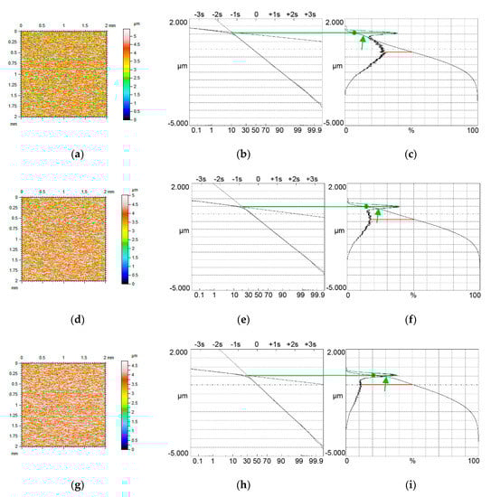 Contour plots (a,d,g) surface probability plot (b,e,h), material ratio curve and probability distribution (c,f,i) of two-process measured surfaces characterized by the following parameters: Spq = 0.31 µm, Svq = 1.61 µm, Smq = 24% (a–c), Spq = 0.49 µm, Svq = 2.89 µm, Smq = 15% (d–f) and Spq = 0.43 µm, Svq = 1.69 µm, Smq = 20% (g–i), three surfaces have bimodal ordinate distributions.