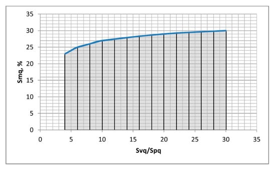 When the Smq material ratio was 10% and the Svq/Spq ratio was 4.17, the smallest slope of the material ratio curve was obtained for the material ratio of 50% (green circle in Figure 4c). Due to an increase in the Smq parameter to 20%, the smallest slope of the material ratio curve corresponded to the Smq parameter. Owing to an increase in the Smq material ratio, the skewness Ssk decreased (from −0.35 to −0.57). When the Smq parameter further increased to 25%, only one peak was visible in the ordinate distribution—unimodal distribution took place.