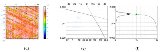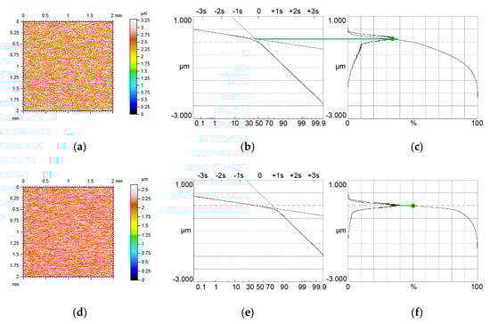 A similar situation occurred when the Svq parameter increased to about 0.7 µm (Figure 5). The amplitudes of both modes are similar for the Smq parameter of 10% (Figure 5c); therefore, the bimodal ratio increased compared to Figure 4c. This ratio is also higher in Figure 5f, compared to Figure 4f, when the Smq parameter increased to 20%. When the Smq parameter increased to 25%, the amplitude probability distribution was still bimodal, but when Smq was 30% unimodal distribution occurred. Similar to lower Svq/Spq ratio, the smallest slope of the material ratio curve corresponded to the material ratio of 50% for the Smq parameter of 10% and to the material ratio of 20% when the Smq parameter increased.