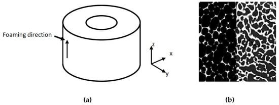 Analogue bone geometry and cellular structure: (a) the cylindrical piece of cellular polyurethane foam (density 320 kg⋅m−3) had an inner diameter of 15 mm, outer diameter of 45 mm, and height 40 mm; (b) closed-cell structure of polyurethane foam (a) compared with open-cell structure of bovine cancellous bone (b).