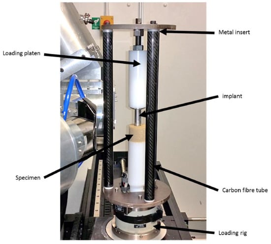 A support structure was required to constrain the assembly and allow application of compressive loading. This needed to be constructed from a material that would not substantially attenuate X-rays. Three carbon fibre tubes were incorporated in the loading rig to provide the necessary support—as shown in Figure 2. Aluminium inserts were glued into the tube ends to allow bolting to the top and bottom plates. Each aluminium insert extended 35 mm into the tube ends to ensure no interference with the field of view/X-ray beam, whilst still providing sufficient stability.