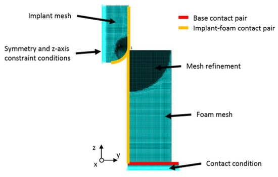 Axisymmetric Finite Element (FE) model of the experimental set-up to interpret results. Mesh refined close to the region of contact. Different boundary conditions used for the implant and analogue bone.