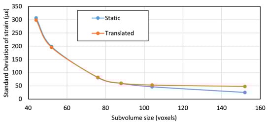 Strain accuracy (bias; mean strain) of static and translated scans was less than 10 με for all subvolume sizes; the DVC calculated translation was 2% higher than the applied stage displacement. The strain accuracy of the magnification change was within 5% of that calculated from differences between scan resolutions. As shown in Figure 4, precision errors (standard deviation of strain) were near-identical for the static and translated tests, with translated scan errors being slightly higher at larger subvolume sizes. Figure 5 shows the precision errors resulting from the magnification change and virtual displacements. Precision error for the magnification change scans plateaued at the central subvolume size. The lowest accuracy error for the virtual strains was found at 2% applied virtual strain, whilst the 10% virtual strain had the largest error. The noise study and analysis using virtual displacements suggested a subvolume size of 76 voxels and an overlap of 50% would be appropriate, to give the optimal balance of low noise and high spatial resolution (25.6 um × 76 × 50% = 0.972 mm).