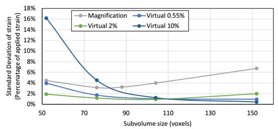 Influence of subvolume size on precision error between virtually strained and magnification change analyses.