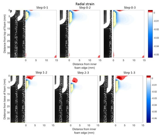 - FE results overestimated DVC strain magnitudes in all directions. The overestimation of the radial, hoop, and axial strains indicates a relaxation of the predicted strain. The likely cause is the local crushing of the cellular structure, which was not incorporated in the bilinear elastoplastic FE constitutive model. When polyurethane foams of the same density have been compressed in displacement control, stress relaxation has been observed in the plateau region of the stress curve [26,36]. Thus, localised crushing near the implant would be expected to reduce load transferred to the rest of the analogue bone, giving a gross reduction in strain. Visual inspection (Figure 6) demonstrated that local crushing was occurring during the tests. The machining of the cavity could have exacerbated the effect: milling of the internal diameter disrupts the cellular structure, and makes it more vulnerable to local collapse under load. Note the size of the foam cells and magnitude of radial displacement due to the interference (0.25 mm) are in the same order of magnitude.