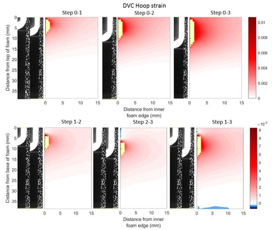 - Identification of suitable DVC parameters. The subvolume size study indicated a size of 0.97 mm would be a suitable starting point for future DVC experiments involving similar geometries and structures. This was sufficiently sensitive to capture the most important radial and hoop strain signals, with spatial resolution to indicate the continuum-scale strain gradients.