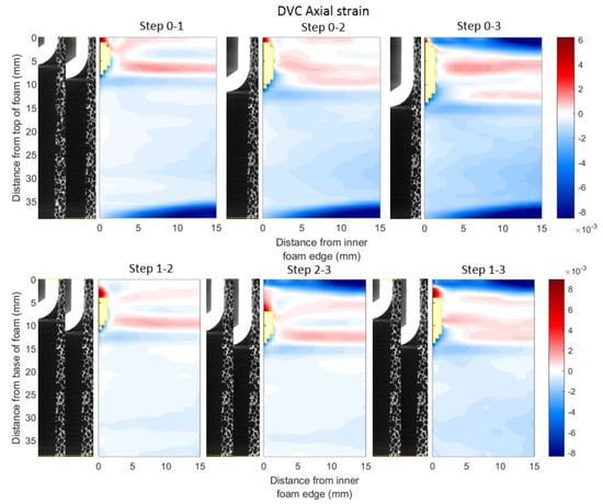 As the FE results showed similar strain fields for each displacement step, only the fields of the final displacement step (Step 3), compared to the reference scan, are presented.
