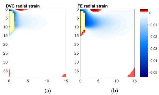 Comparison of radial strain fields measured and predicted, Digital Volume Correlation (a) and Finite Element (b), for Displacement Step 3 relative to reference scan. Measurements with correlation coefficients below 0.9 have been excluded from both fields, at spatial locations shown in yellow.