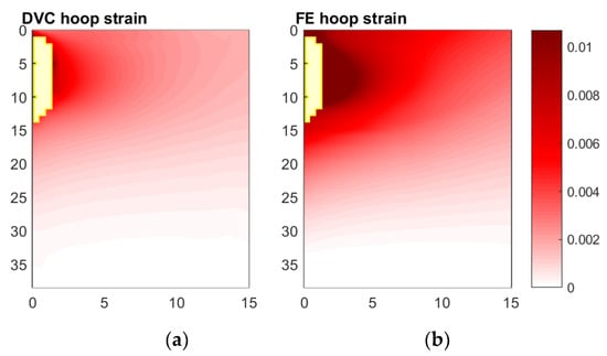 Comparison of hoop strain fields measured and predicted, Digital Volume Correlation (a) and Finite Element (b), for Displacement Step 3 relative to reference scan. Measurements with correlation coefficients below 0.9 have been excluded from both fields, at spatial locations shown in yellow.