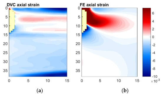 Comparison of axial strain fields measured and predicted, Digital Volume Correlation (a) and Finite Element (b), for Displacement Step 3 relative to reference scan. Measurements with correlation coefficients below 0.9 have been excluded from both fields, their spatial locations are shown in yellow.