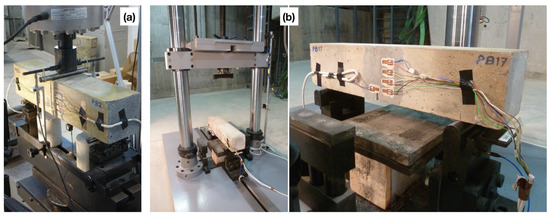 The concrete PA was reinforced with 40 kg/m straight steel fibers of 13 mm in length, 0.2 mm in diameter (Dramix OL 13/0.20, 65 in aspect ratio), the slump flow reached 70 cm × 70 cm in cross–direction diameters. In contrast, the concrete PB and PC were additionally reinforced with long hooked-end steel fibers of 30 mm in length, 0.38 in diameter (RC 80/30 BP, 80 in aspect ratio) of 20 and 60 kg/m, respectively. The corresponding slump flow tests for PB and PC reached 66 cm × 67 cm and 57 cm × 57 cm. Characterization tests were carried out using cylindrical specimens of 150 mm × 300 mm (diameter × height) to measure the compressive strength at the age of seven months. The results are given in Table 1. Additionally listed in the table are the measured elastic modulus (E), Poisson’s ratio ) and the material density (). Furthermore, the flexural strength (or the first-crack strength, the modulus of rupture), , can be estimated through a three-point bending test (to be explained in the next subsection) as follows,