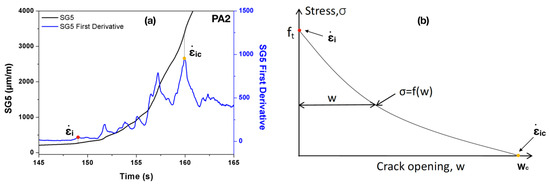 From the recordings of the strain gage SG5, we can take the first derivative with respect to time and obtain the corresponding strain rate evolutions, see Figure 3a. Based on the cohesive theories of fracture, we expect an abrupt change in the strain rate curve for each abrupt slope change of the softening curve given in Figure 3b. The maximum strain variation should occur at the formation of a stress-free crack tip, i.e., when the critical crack opening displacement, , is obtained. We denominate the corresponding strain rate as . In the same way, the first peak in the –time curve can be identified as the emergence of the cohesive crack tip, when the crack opening displacement is still null, i.e., .