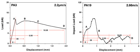Measuring the toughness indices using the load-deflection curve (shown for PA3 loaded at 2.2 /s and PA19 impacted at 2.66 m/s).