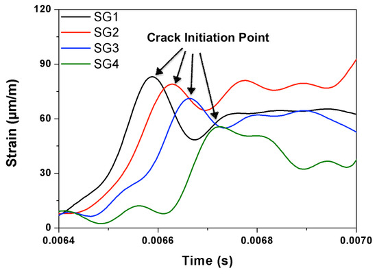 As mentioned above, the strain gage SG1 is glued to the beam surface at the same height as that of the notch tip but with a horizontal distance of 13 mm. Therefore, the shortest time that a stress wave needs to travel from the notch tip to SG1 is less than 3 s whereas the time interval between adjacent strain readings is 4 s. Consequently, we can neglect the time delay of the gage readings between SG1 and SG5. The strain peak observed in SG1 can be subsequently used to determine the load upon the crack initiation from the notch tip.